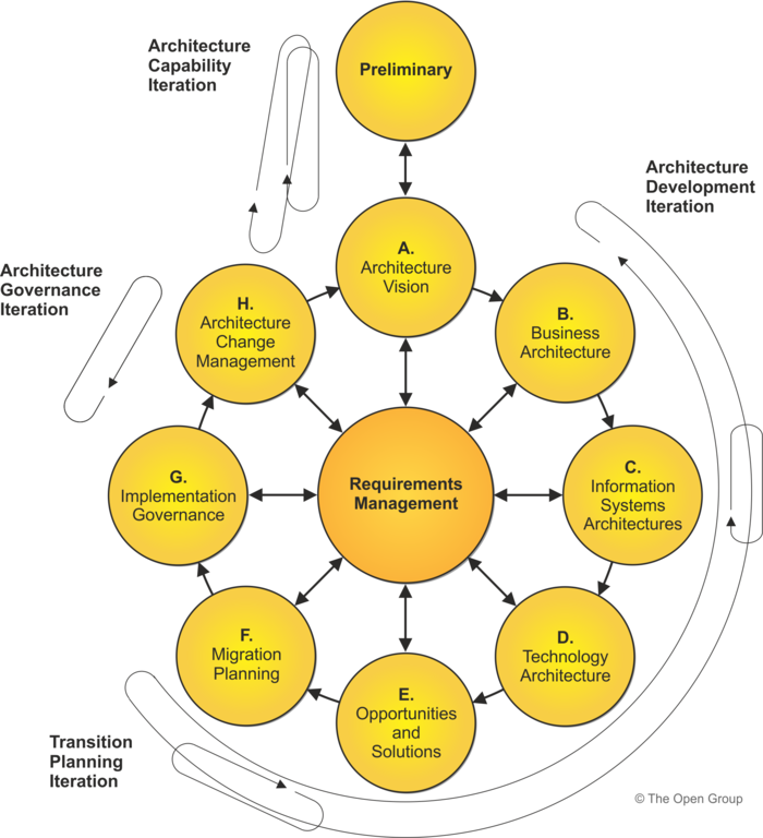 This iteration comprises a pass through the Business Architecture, Information Systems Architecture, and Technology Architecture phases of the ADM, focusing on definition of the target. Opportunities, solutions, and migration plans are also considered to drive out the focus for change and test feasibility. |