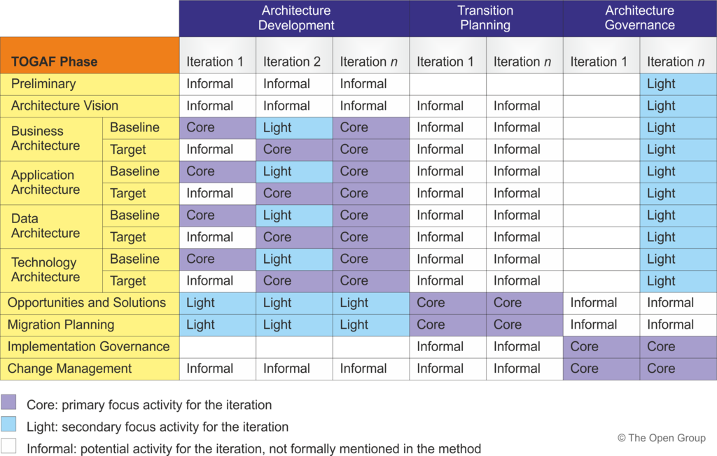Each iteration cycle crosses multiple TOGAF ADM phases. The following tables show at a high level which phases should be completed for which iteration cycle, showing activity that is core (i.e., the primary focus of the iteration), activity that is light (i.e., the secondary focus of the iteration), and activity that may be informally conducted (i.e., some activity may be carried out, but it is not explicitly mentioned in the ADM).