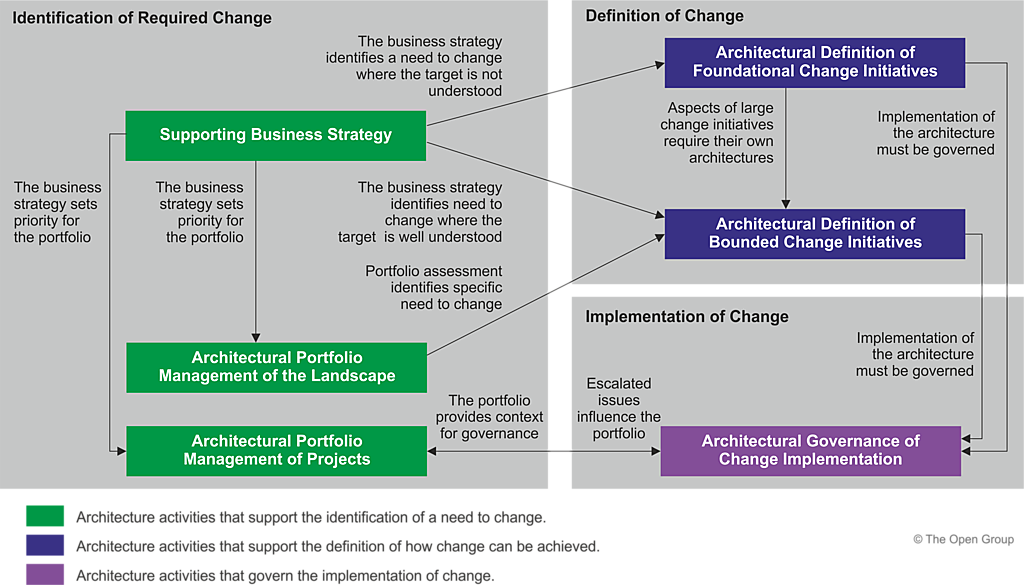 The initial Architecture Governance iteration establishes a process for governance of change and also puts in place the appropriate people, processes, and technology to support managed access to and change of the defined architecture. |